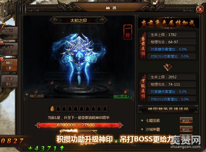 神印的激活条件是:通关神魔之塔第25层后开启。提升神印等阶的好处在于提升生命上限和物理攻击,英雄无处可逃。