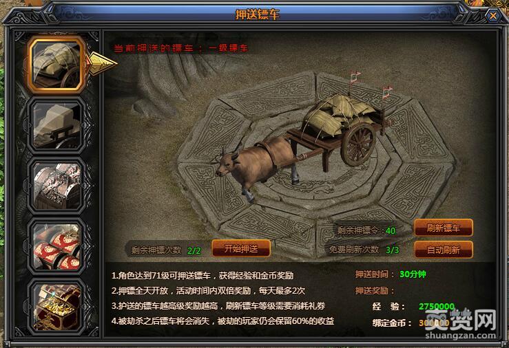 将镖车从比奇城 [林捕头]处押送到封魔谷 [李捕头]处,就能奖励大量经验和金币奖励。
