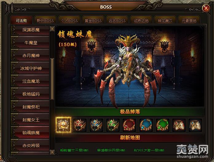 在刷新地图方面:锁魂蛛魔存在的地图有3个。分别是蚂蚁巢穴三层、帝鸿祭坛四层和BOSS之家一层。三张地图上的BOSS等级属性都相同,掉宝也都差不多,没有孰强孰弱之说。