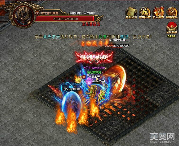 第44关BOSS:神之雷炎蛛魔,等级130级,血量2400000点,推荐115级攻略,推荐战力128万再攻略。