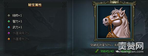 第3次突破成功率60%,失败返回50%资源。需要对应的普通秘宝突破资源30个,以及银两30万才能进行一次突破。