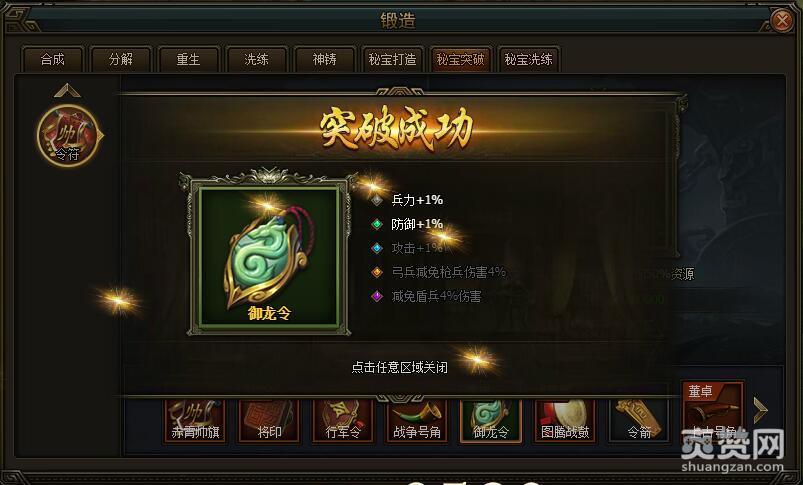 今天我们先依次选择锻造-秘宝突破-令符-普通-第五样令符御龙令,进行突破吧。