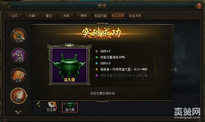 蚩尤鼎突破四:每装备一件特殊蚩尤套,兵力+960。