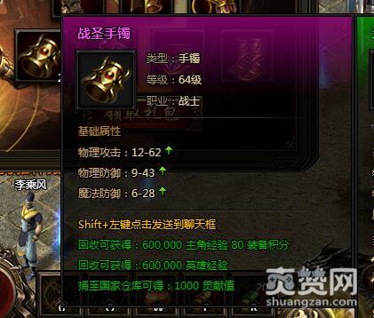 战圣手镯。64级战士手镯。提欧物理攻击、物理防御以及魔法防御的略微增长。
