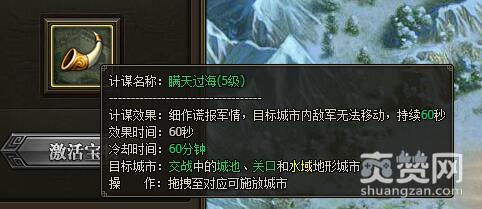 计谋效果:细作谎报军情,目标城市内敌军无法移动,持续60秒