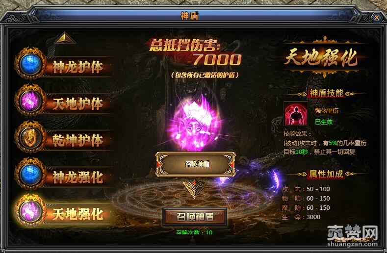 最后神盾每天只能够召唤10次,每2个小时就会回复一次使用次数,死亡或者离线都会消失神盾加成。