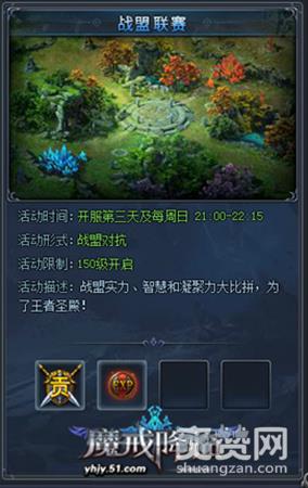 51《永恒纪元》是一款大型多人在线角色扮演网络游戏(MMORPG)。游戏题材为西方魔幻类型,采用第三人称45度固定视角即时战斗方式,游戏画面使用3D高模渲染2D图片的输出方式,让玩家置身于永恒大陆抵抗邪恶力量侵蚀!战盟联赛是战盟实力、智慧和凝聚力的大比拼,为了王者圣殿,快拿起的你的武器参战吧!战盟联赛的时间在开服第三天及每周日的21:00,凡是等级达到150且加入任一战盟的玩家均可参加,不过需保证自己加入战盟时长达到3个小时哦。