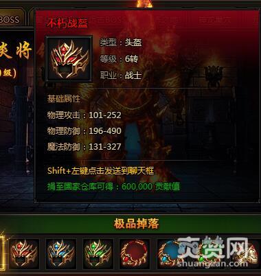 在掉落极品道具方面:赤炎将领会掉落赤炎将领徽章、不朽战盔(6转)、不朽法盔(6转)、不朽道盔(6转)、不朽战链(6转)、不朽法链(6转)、不朽道链(6转)、不朽战带(6转)以及不朽法带(6转)。