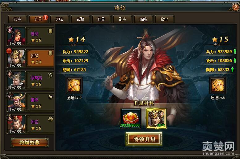 孙策14星时,兵力:959822,攻击:101229,防御:67185,升星需要消耗8000升星丹,孙策5个。