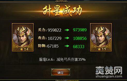 14星升15星时,兵力:959822->973989,攻击:107229->108856,防御:67185->68333。盾墙Lv.6:减免弓兵伤害35%。