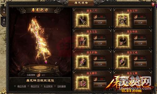 玩家可将各种屠龙装备,佩戴在角色的副装槽里,这些装备不会与普通装备发生冲突。其中,屠龙护腕、屠龙宝戒两件装备,可同时佩戴两件。玩家身上若能集齐10件屠龙装备,可以激活无双伤害减免30%的效果。玩家可获得屠龙装备后,还能对装备进行进阶操作,提高装备的属性效果。屠龙装备进阶要消耗一些屠龙神石,随着装备进阶等级提升,消耗的屠龙神石会增多。