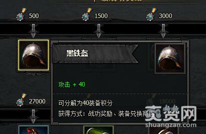 500点战功达成后。战功奖励可以获得黑铁盔。攻击+40。黑铁盔可以分解,分解为40装备积分。获得方式:战功奖励、装备兑换商店。