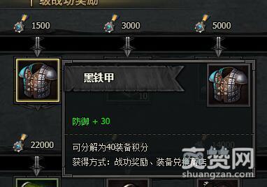 1500点战功达成后。战功奖励可以获得黑铁甲。防御+30。黑铁甲同样可以分解,分解为40装备积分。获得方式也是:战功奖励、装备兑换商店。