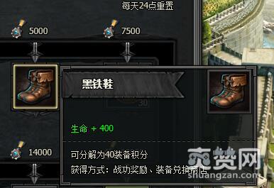 5000点战功达成后。战功奖励可以获得黑铁鞋。生命+400。可分解为40装备积分。获得方式:战功奖励、装备兑换商店。