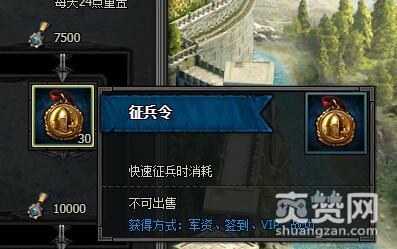 7500点战功达成后。战功奖励可以获得征兵令30个。作用是快速征兵时消耗。不可出售。获得方式:军资、签到、VIP、战力。