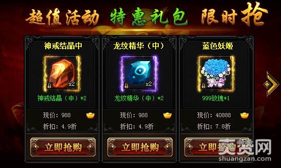 活动期间,可购买超优折扣每日限购礼包,神戒结晶、蓝色妖姬、传承之力、龙纹精华、印记灵魄、探宝符、羽毛、魂玉结晶、护盾结晶、暗器结晶、成就令牌、声望令牌等极品道具仅限活动期间跳楼优惠!