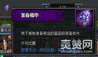 装备精华。用于换取装备商店的高品级装备碎片。不可出售。获得方式:战功奖励、装备兑换商店。