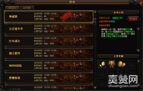每天的10:00-12:00和22:00--24:00是神威狱开放的时间。神威狱一共13层,每层均有BOSS镇守,玩家进入下一层时需要击杀神威统领,才能获得【神威通行证】,玩家每闯入下一层就可获得大量金币和注灵结晶奖励。得到的奖励会自动进入背包,背包的空间要足够大,如果你回收物品,就会自动传出,在想进入神威狱就只能等下个入口开放时间了。每次进去神威狱限时2小时,超时了会自动传出。