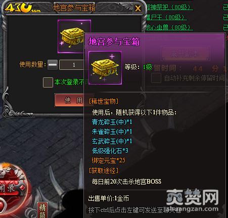 想要进入43u《魔魂之刃》地宫BOSS可是有条件的哦!每次进入地宫需要消耗一张地宫进入凭证,这个也不是白消耗的,每消耗一张地宫进入凭证可增加一小时地宫停留时间。