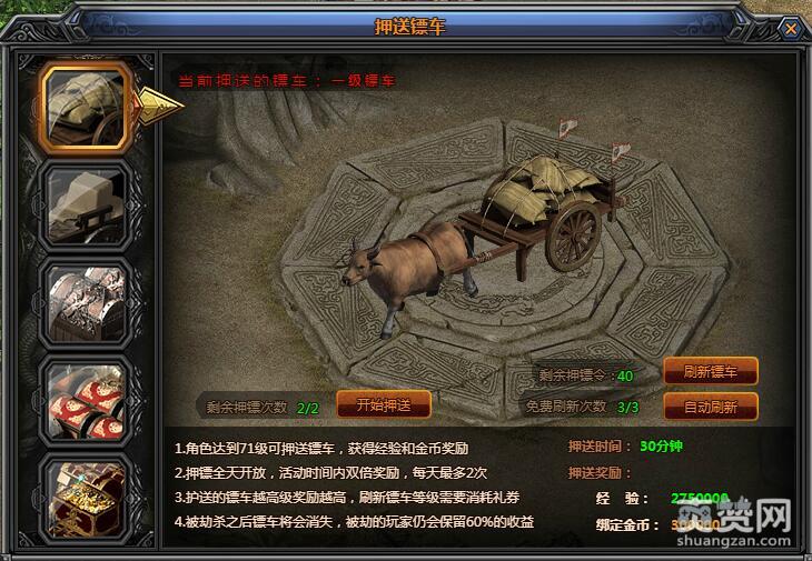 每天会有三次护送镖车的机会,镖车从九龙城护送到土城NPC佟掌柜手中,护送完之后便可获得海量经验、能量点、龙鼎经验。