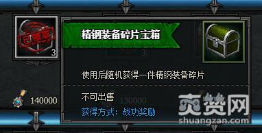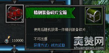 75000战功。精钢装备碎片宝箱*3。使用后随机获得一件精钢装备碎片,共计3件。这个装备碎片同样也难逃被分解的命运。