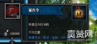 90000战功。征兵令*30。快速征兵时消耗。在游戏前期,或者您是小R玩家,这个道具还是挺好用的。但是到游戏后期,成为大R后,加上影子漫天的幻境。可以基本忽视这个道具。小编打倒游戏后期时,利用放影子等技巧,基本征兵令是花不完的。