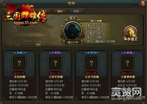 51《三国群雄传》国家系统由国家等级,官职,国家发展,军资,国家科技,以及国战等元素所组成。随着国家等级的提高,所属国家成员会获得相应的国家特权。国家经验的主要来源是国战,国战的成败决定了一个国家等级提高的速度。