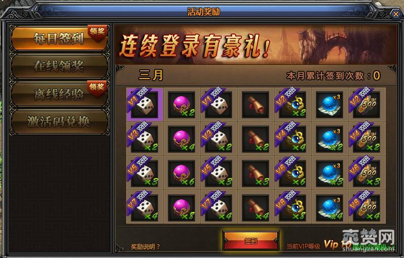另外每次签到对于VIP玩家而言奖励更是丰厚,系统会根据角色当前的VIP等级,赠送符合VIP等级的多倍奖励,如果玩家提升VIP等级后,改约之前的奖励将以邮件的形式会补发给玩家。