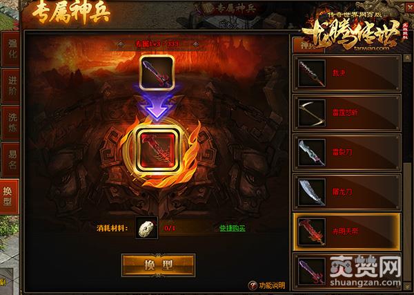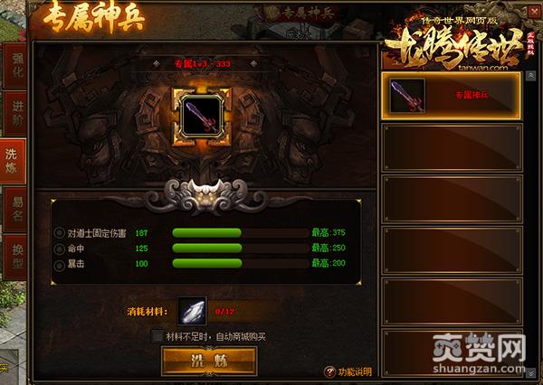强化满级就真的满足了吗?传奇世界网页版《龙腾传世》还有专属神兵进阶的功能,神兵强化等级达到蓝钻+6后可进行进阶,进阶以后还能获得暴走技能,只要进入暴走模式,每次攻击都必定暴击,刀刀飘红的快乐谁用谁知道。专属神兵进阶到LV3以后,洗练神兵可以大幅提升神兵的传奇属性。专属神兵材料可从神魔任务、神魔商店、商城获得。