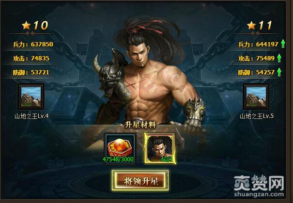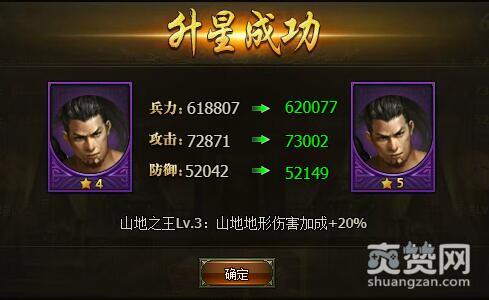 1星升2星,兵力:616268变616903,攻击:72609变72674,防御:51792变51845,山地之王Lv.1变山地之王Lv.2,升星材料需要升星丹20颗,将领需达到10级。