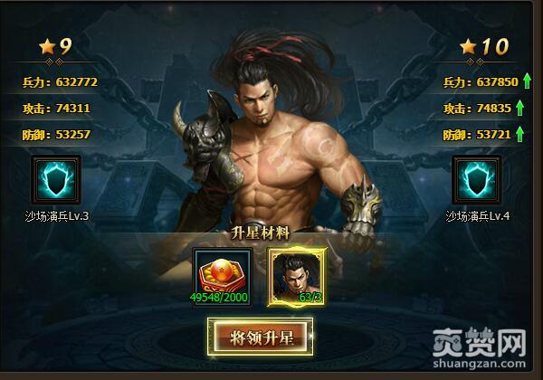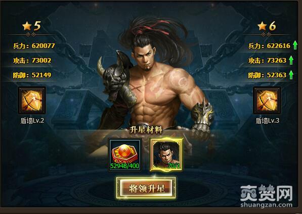 升到50级后,5星升6星,兵力:620077变622616,攻击:73002变73263,防御:52149变52363,盾墙Lv.2变盾墙Lv.3,盾墙Lv.3:减免弓兵伤害20%。