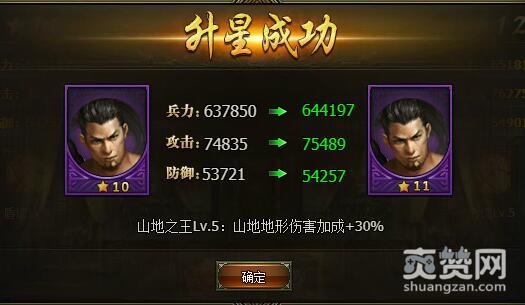 升到10级后,1星升2星,兵力:616268变616903,攻击:72609变72674,防御:51792变51845,山地之王Lv.1变山地之王Lv.2,山地之王Lv.2:山地地形伤害加成+15%。