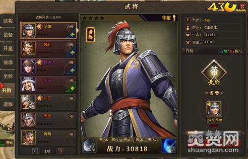在43u《兵法三国》武将系统中,玩家可以清楚的查看到武将的基本属性和使用突飞令,而且有的武将还有独特技能哦!把霸气的装备穿在武将身上,这样武将的能力也将得到提升哦!想要装备变得强大就使用器升星石和装备碎片来升阶装备哦!