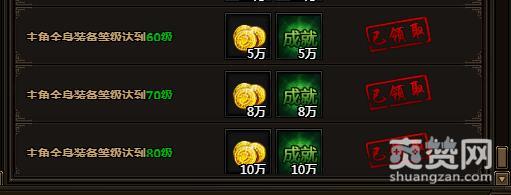 主角全身装备等级达到80级。可获金币10万,成就积分10万。