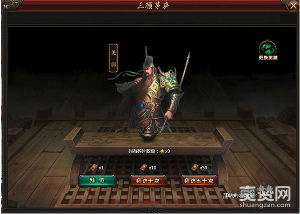 在三顾茅庐中,可以使用拜帖邀请里面的武将,使用拜帖可邀请大部分紫将和金将。一张拜帖可兑换一个武将碎片。