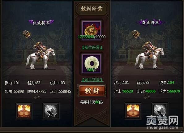 从伏波将军到奋威将军 敕封所需军功40000,美玉2个,需要将领60级