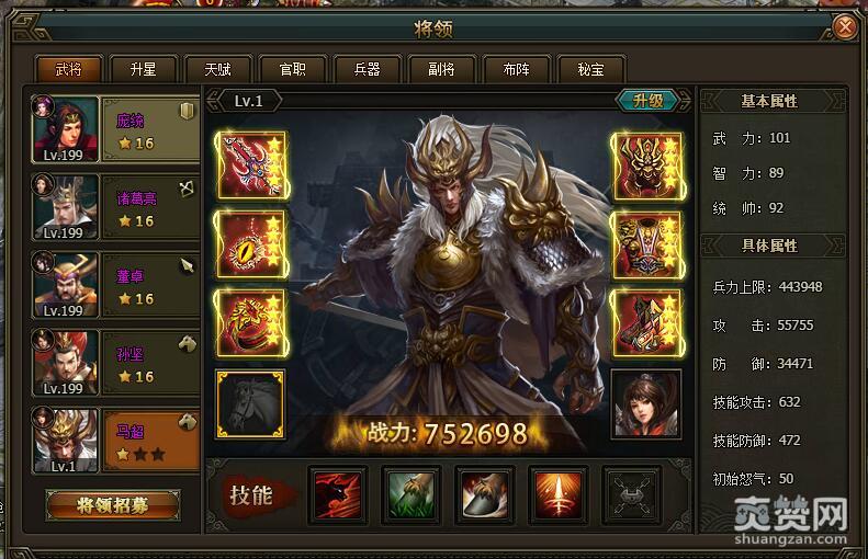 1级状态下,如果你把战斗科技里的骑兵科技都点满,再把所有武器都神铸到神级武器,兵器也全满,带副将小乔的话,1级的战力可以达到752698。如果你没有给马超携带任何武器,若是卸掉所有的武器,不卸掉副将,那么马超的战力就只有507686。上图是全兵器全神武带副将小乔时和除换装外什么都不带的数据,可以借鉴一下。