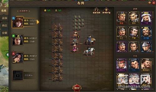 在布阵中你可以布置在世界地图中战斗的各个阵型,拖拽右侧列表中的武将士兵到左侧布阵区域即可完成上阵,拖拽左侧布阵区域中的武将士兵到其他区域即可完成下阵,点击“重新布阵”可以快速将当前阵型所有武将士兵下阵。你可以根据上阵武将和士兵计算战力和消耗的粮草,从而在太学升级排兵布阵可以布置更多的阵型。