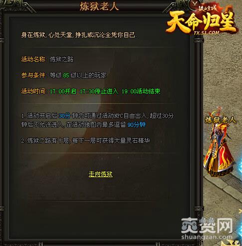 51《铁血皇城》炼狱之路更是惊险万分,稍不留神就有可能粉身碎骨。活动时间开始时间是每天17:00-17:30,活动入口NPC名称:炼狱老人,活动开启后30分钟内可通过NPC自由出入,在活动地图内最多逗留90分钟;每层均有一只boss,击杀有几率掉落高级装备,击杀小怪可获得BOSS挑战令牌;炼狱之路有十层,每层都有进入到下一层的NPC,消耗BOSS挑战令牌或元宝可进入下一层,同时可获得一定数量的灵石精华奖励,层数越高需要的boss挑战令牌与元宝越多,获得的灵石精华也越多,灵石精华可用于装备槽位注灵。