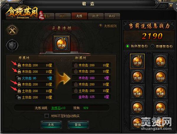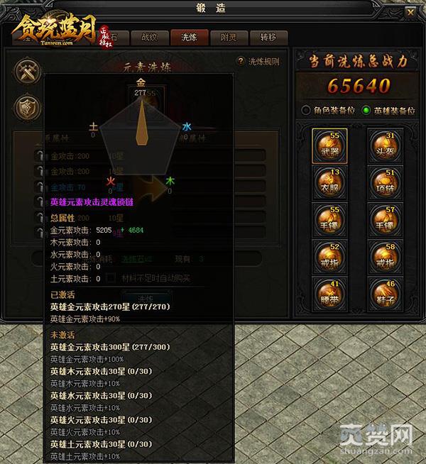 金、木、水、火、土五大种类是古人对宇宙万物的划分,《贪玩蓝月》将五行元素系统创造性的加入到游戏当中来,让游戏玩法更加丰富,同时也使得玩家在PK时能获得更多的乐趣。五行相生相克,同种类的元素攻击只能被同种类的元素防御,所以观察你的敌人的五行洗练也变成了十分重要的事情。洗练元素星级越高,攻防属性也就越高。