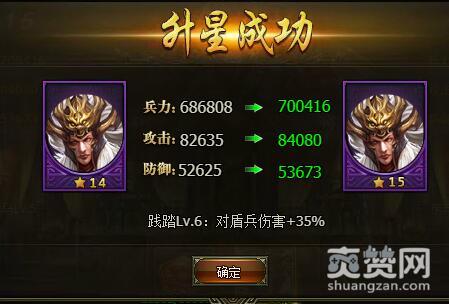 满足条件140级后,可以14星升15星,兵力:686808变700416,攻击:82635变84080,防御:52625变53673,践踏Lv.5变践踏Lv.6,践踏Lv.6:对盾兵伤害+35%。
