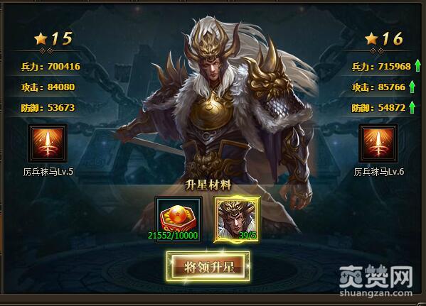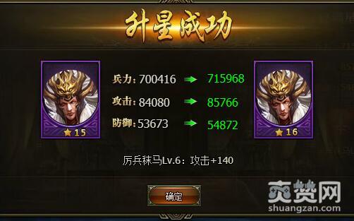满足条件150级后,可以15星升16星,兵力:700416变715968,攻击:84080变85766,防御:53673变54872,厉兵秣马Lv.5变厉兵秣马Lv.6,厉兵秣马Lv.6:攻击+140。