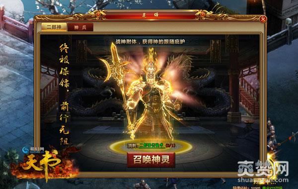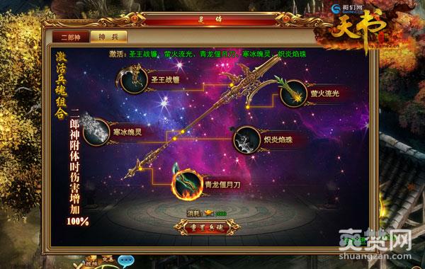 在哥们网《天书世界》灵体系统,玩家解锁神兵孔位,装备专属兵魂,兵魂属性翻倍;而且在神兵玩法中,当玩家激活了兵魂圣王战镰、萤火流光、青龙偃月刀、寒冰魄灵、炽炎焰珠即可获得组合技能——二郎神附体伤害增加100%!