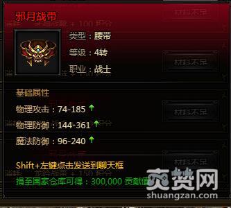 邪月战带。4转腰带,物理攻击提升74-185,物理防御提升144-361,魔法防御提升96-240。