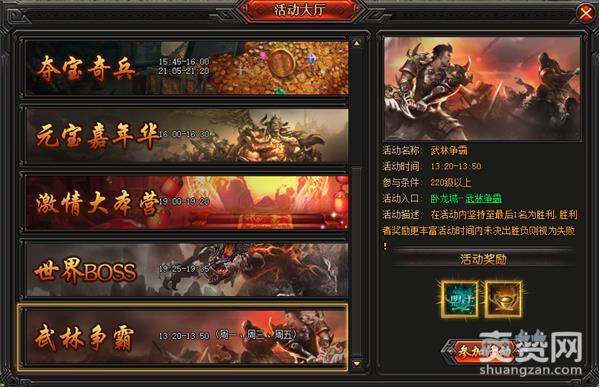 《炎龙传奇》武林争霸活动时间:13:20-13:50;玩家参与条件是角色等级达到80。活动入口在威龙城-武林争霸的NPC处。活动开启10分钟内可进入活动地图,10分钟之后入口关闭。从活动入口关闭至活动结束,期间内地图中只剩最后一个人可申请成为武林盟主,成为武林盟主后可获得奖励 ——“武林盟主”称号、1000元宝。