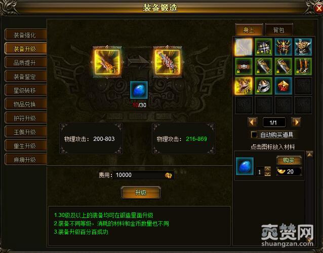 装备升级,是提升装备等级,装备等级越高,属性越强,单击右边的装备就可以进行升级了,30级以上的装备才可以升级,装备升级大大提升装备属性,装备升级需要消耗装备升级石和金币,不同品质的装备,所需的升级石也不同,装备等级越高,所需的升级石越多,升级成功率100%。