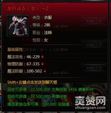 龙吟法衣。2转以上法师可装备。提供魔法攻击46-229点,物理防御67-335点,魔法防御100-502点。