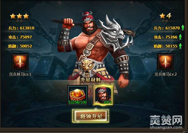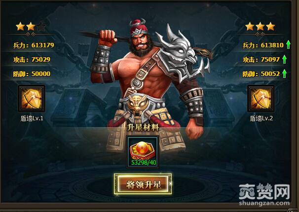 2星升3星,兵力:613179变613810,攻击:75029变75097,防御:50000变50052,盾墙Lv.1变盾墙Lv.2,升星材料需要升星丹40颗,将领需达到20级。