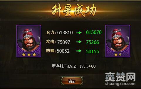 升到30级后,3星升4星,兵力:613810变615070,攻击:75097变75266,防御:50052变50155,厉兵秣马Lv.1变厉兵秣马Lv.2,厉兵秣马Lv.2:攻击+60。
