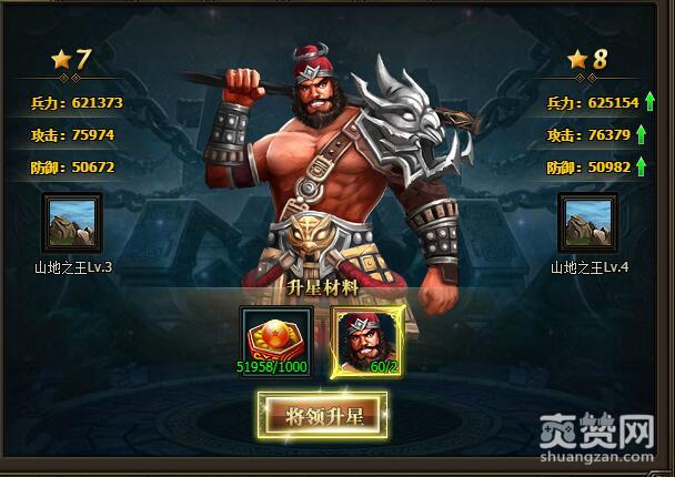 7星升8星,兵力:621373变625154,攻击:75974变76379,防御:50672变50982,山地之王Lv.3变山地之王Lv.4,升星材料需要升星丹1000颗,张飞2个,将领需达到70级。